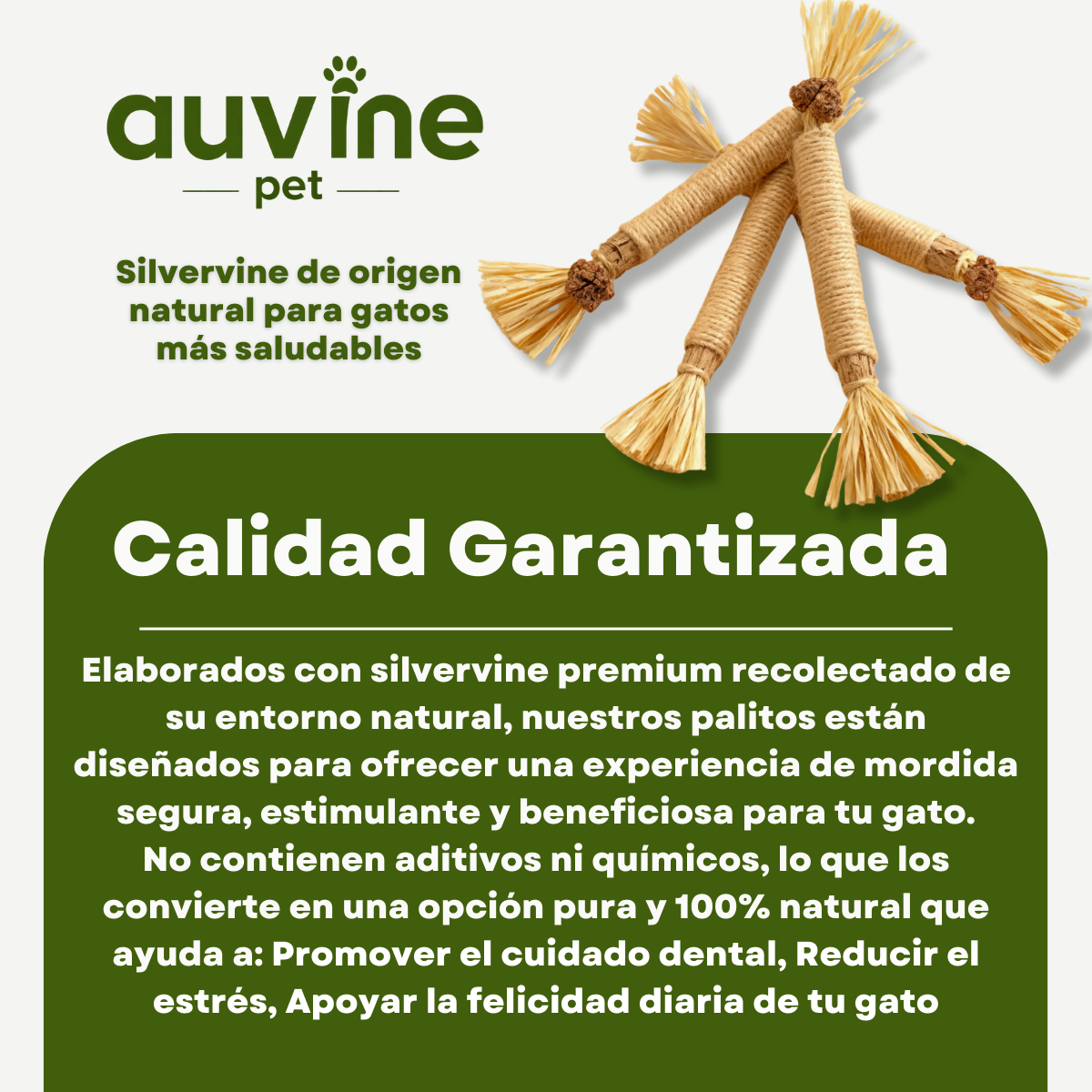 Está hecho con silvervine natural, sin químicos ni aditivos, y combina juego, estimulación mental y cuidado dental en un solo producto.